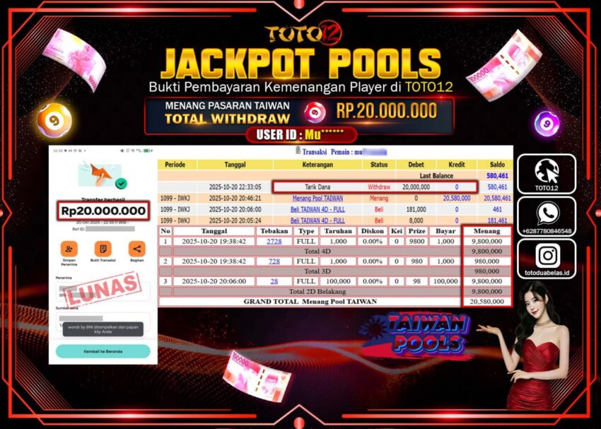 Selamat kepada Member Kami Mu****** Telah Jackpot dan berhasil mendapatkan kemenangan besar pada permainan JACKPOT POOLS PASARAN (TAIWAN) Dengan Kemenangan Sebesar Rp.20.000.000 –. Setelah mengisi Fomulir Withdraw dengan Kurang waktu 1-2 Menit Dana sudah kami Trasnfer kepada Pemilik Userid dan dana sudah dapat di cairkan oleh pemenang. Bukti Pembayaran yang TOTO12 berikan merupakan Bukti Pembayaran yang SAH / VALID yang langsung Di dapatkan melalui transaksi dari Bank yang di Tunju.