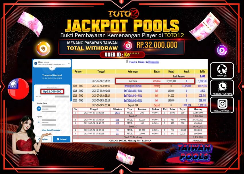Selamat kepada Member Kami Ke****** Telah Jackpot dan berhasil mendapatkan kemenangan besar pada permainan JACKPOT POOLS PASARAN (TAIWAN) Dengan Kemenangan Sebesar Rp.32.000.000 –. Setelah mengisi Fomulir Withdraw dengan Kurang waktu 1-2 Menit Dana sudah kami Trasnfer kepada Pemilik Userid dan dana sudah dapat di cairkan oleh pemenang. Bukti Pembayaran yang TOTO12 berikan merupakan Bukti Pembayaran yang SAH / VALID yang langsung Di dapatkan melalui transaksi dari Bank yang di Tunju.
