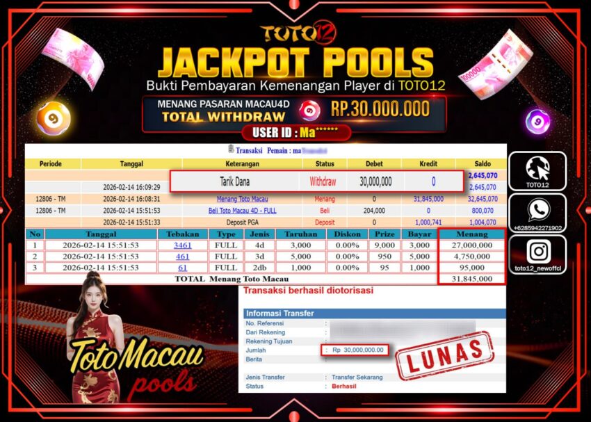 Selamat kepada Member Kami Ma****** Telah Jackpot dan berhasil mendapatkan kemenangan besar pada permainan JACKPOT POOLS PASARAN (TOTOMACAU 4D) Dengan Kemenangan Sebesar Rp.30.000.000–.