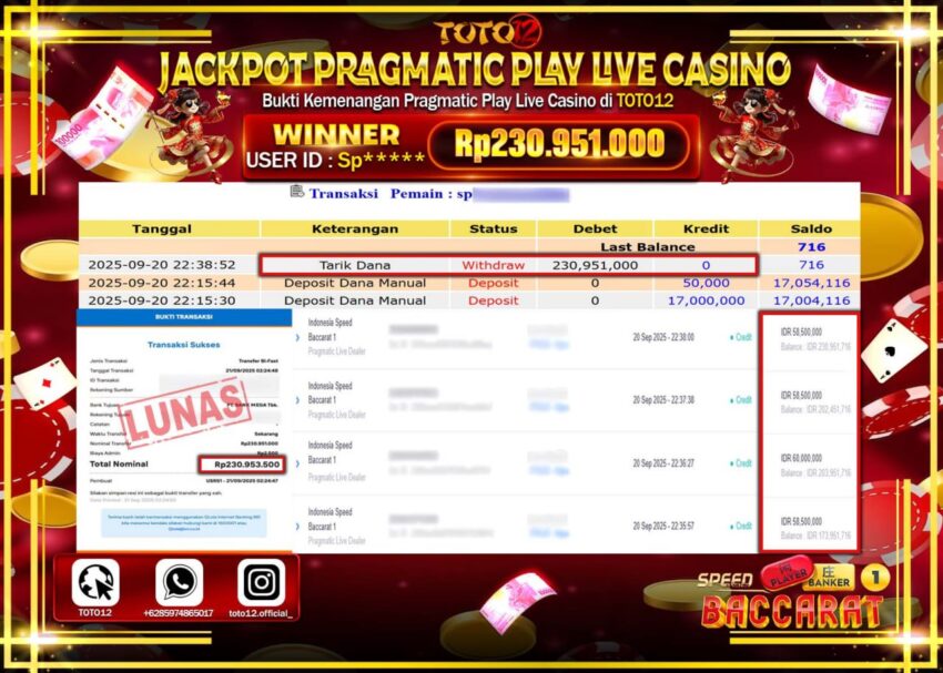Selamat kepada Member Kami Sp****** Telah Jackpot dan berhasil mendapatkan kemenangan besar pada permainan JACKPOT PRAGMATIC PLAY LIVE CASINO (INDONESIA SPEED BACCARAT 1)  Dengan Kemenangan Sebesar Rp.230.951.000 –.  Setelah mengisi Fomulir Withdraw dengan Kurang waktu 1-2 Menit Dana sudah kami Trasnfer kepada Pemilik Userid dan dana sudah dapat di cairkan oleh pemenang. Bukti Pembayaran yang TOTO12 berikan merupakan Bukti Pembayaran yang  SAH / VALID yang langsung Di dapatkan melalui transaksi dari Bank yang di Tunju.
