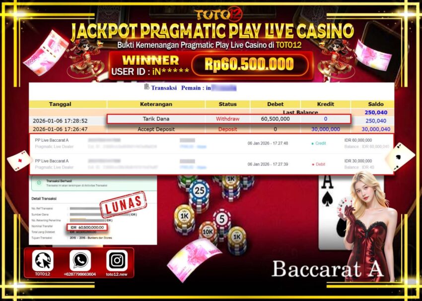 HANYA DI TOTO12 JP PASTI DI BAYAR LUNAS DAN CEPAT!!!!!! JACKPOT PRAGMATIC PLAY LIVE CASINO (LIVE BACCARAT A) Rp.60.500.000 !!!!