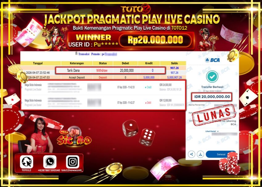 Selamat kepada Member Kami Pu***** Telah Jackpot dan berhasil mendapatkan kemenangan besar pada permainan JACKPOT PRAGMATIC PLAY LIVE CASINO (MEGA SICBO) Dengan Kemenangan Sebesar Rp.20.000.000–.