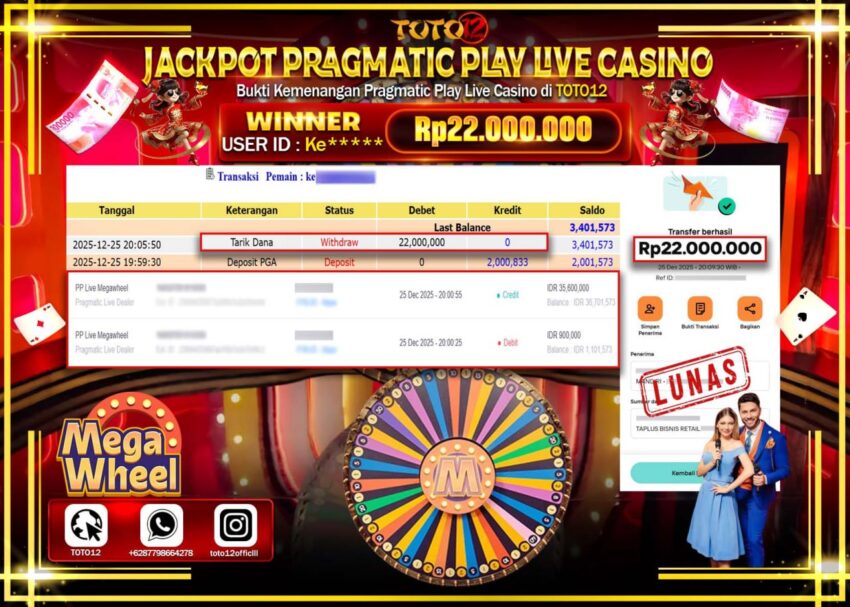 HANYA DI TOTO12 JP PASTI DI BAYAR LUNAS DAN CEPAT!!!!!! JACKPOT PRAGMATIC PLAY LIVE CASINO (MEGA WHEEL) Rp.22.000.000 !!!!