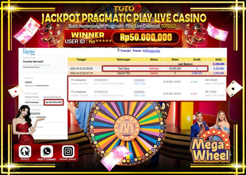 Selamat kepada Member Kami Ke****** Telah Jackpot dan berhasil mendapatkan kemenangan besar pada permainan JACKPOT PRAGMATIC PLAY LIVE CASINO (MEGA WHEEL)  Dengan Kemenangan Sebesar Rp.50.000.000 –.  Setelah mengisi Fomulir Withdraw dengan Kurang waktu 1-2 Menit Dana sudah kami Trasnfer kepada Pemilik Userid dan dana sudah dapat di cairkan oleh pemenang. Bukti Pembayaran yang TOTO12 berikan merupakan Bukti Pembayaran yang  SAH / VALID yang langsung Di dapatkan melalui transaksi dari Bank yang di Tunju.