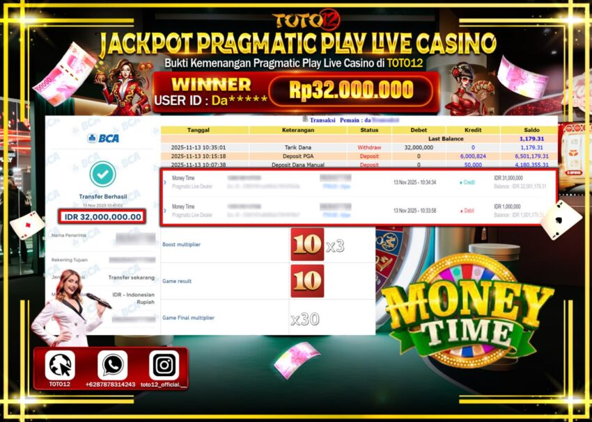 Selamat kepada Member Kami Da****** Telah Jackpot dan berhasil mendapatkan kemenangan besar pada permainan JACKPOT PRAGMATIC PLAY LIVE CASINO (MONEY TIME) Dengan Kemenangan Sebesar Rp.32.000.000 –. Setelah mengisi Fomulir Withdraw dengan Kurang waktu 1-2 Menit Dana sudah kami Trasnfer kepada Pemilik Userid dan dana sudah dapat di cairkan oleh pemenang. Bukti Pembayaran yang TOTO12 berikan merupakan Bukti Pembayaran yang SAH / VALID yang langsung Di dapatkan melalui transaksi dari Bank yang di Tunju.