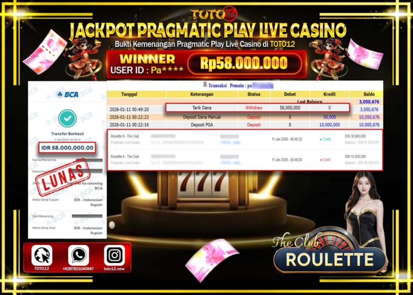 HANYA DI TOTO12 JP PASTI DI BAYAR LUNAS DAN CEPAT!!!!!! JACKPOT PRAGMATIC PLAY LIVE CASINO (ROULETTE 9 THE CLUB) Rp.58.000.000 !!!!