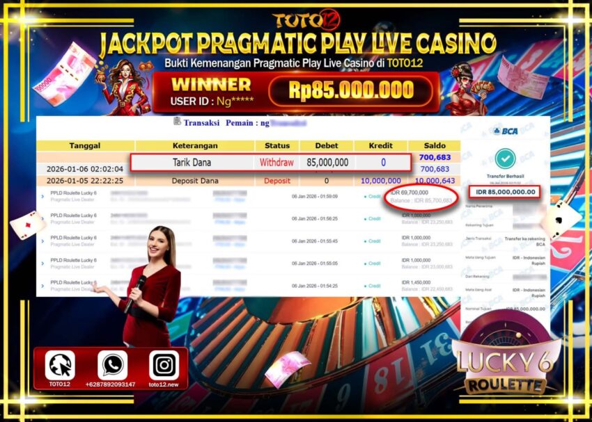 Selamat kepada Member Kami Ng****** Telah Jackpot dan berhasil mendapatkan kemenangan besar pada permainan JACKPOT PRAGMATIC PLAY LIVE CASINO (ROULETTE LUCKY 6) Dengan Kemenangan Sebesar Rp.85.000.000 –.