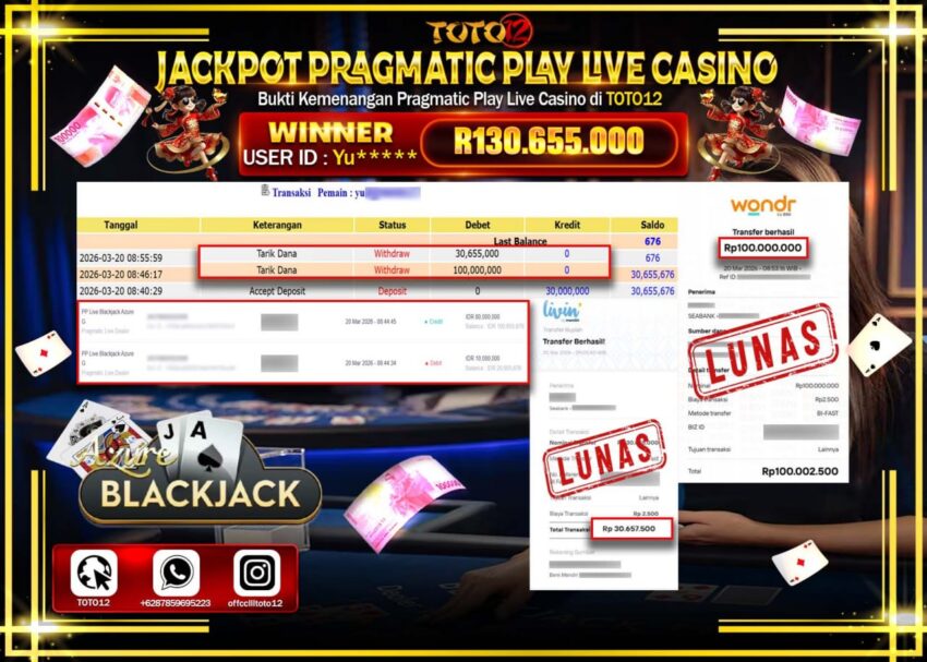 Selamat kepada Member Kami Yu****** Telah Jackpot dan berhasil mendapatkan kemenangan besar pada permainan JACKPOT PRAGMATIC PLAY LIVE GAME CASINO (PP LIVE BLACKJACK AZURE) Dengan Kemenangan Sebesar Rp.130.655.000–.