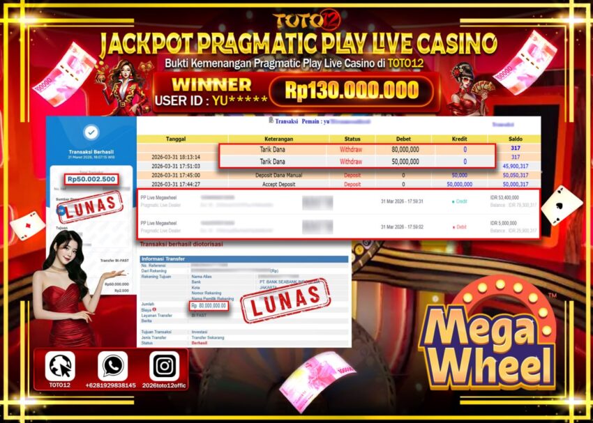Selamat kepada Member Kami Yu****** Telah Jackpot dan berhasil mendapatkan kemenangan besar pada permainan JACKPOT PRAGMATIC PLAY LIVE GAME CASINO (PP LIVE MEGAWHEEL) Dengan Kemenangan Sebesar Rp.130.000.000–.