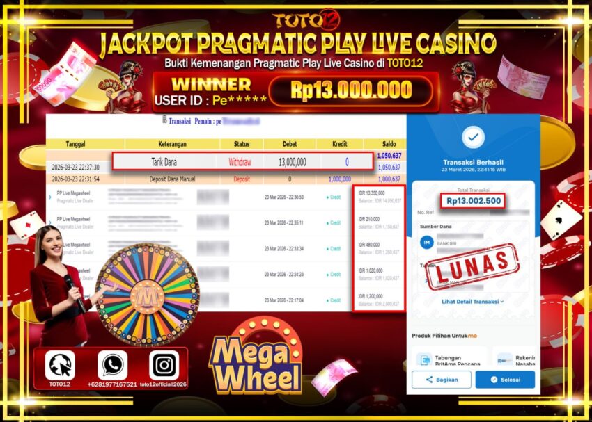 Selamat kepada Member Kami Pe****** Telah Jackpot dan berhasil mendapatkan kemenangan besar pada permainan JACKPOT PRAGMATIC PLAY LIVE GAME CASINO (PP LIVE MEGAWHEEL) Dengan Kemenangan Sebesar Rp.13.000.000–.