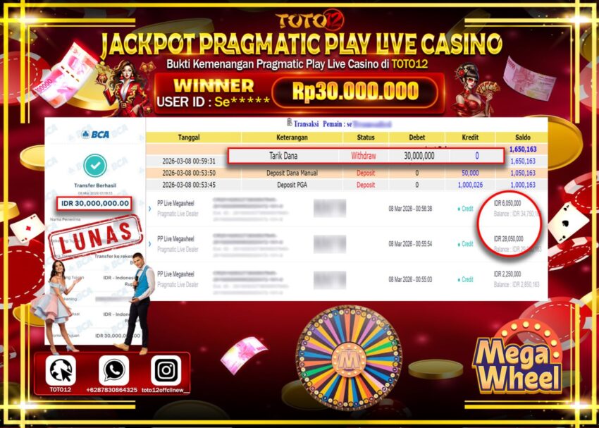 Selamat kepada Member Kami Se******  Telah Jackpot dan berhasil mendapatkan kemenangan besar pada permainan JACKPOT PRAGMATIC PLAY LIVE GAME CASINO (PP LIVE MEGAWHEEL)  Dengan Kemenangan Sebesar Rp.30.000.000–.  Setelah mengisi Fomulir Withdraw dengan Kurang waktu 1-2 Menit Dana sudah kami Trasnfer kepada Pemilik Userid dan dana sudah dapat di cairkan oleh pemenang. Bukti Pembayaran yang TOTO12 berikan merupakan Bukti Pembayaran yang  SAH / VALID yang langsung Di dapatkan melalui transaksi dari Bank yang di Tunju.