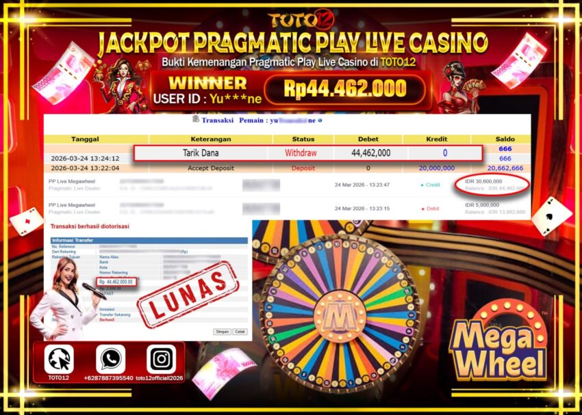 Selamat kepada Member Kami Yu******ne Telah Jackpot dan berhasil mendapatkan kemenangan besar pada permainan JACKPOT PRAGMATIC PLAY LIVE GAME CASINO (PP LIVE MEGAWHEEL) Dengan Kemenangan Sebesar Rp.44.462.000–.