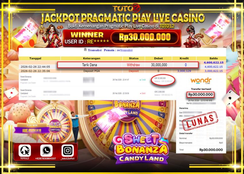 Selamat kepada Member Kami RE**** Telah Jackpot dan berhasil mendapatkan kemenangan besar pada permainan JACKPOT PRAGMATIC PLAY LIVE GAME CASINO (SWEET BONANZA CANDY LAND) Dengan Kemenangan Sebesar Rp.30.000.000–. Setelah mengisi Fomulir Withdraw dengan Kurang waktu 1-2 Menit Dana sudah kami Trasnfer kepada Pemilik Userid dan dana sudah dapat di cairkan oleh pemenang. Bukti Pembayaran yang TOTO12 berikan merupakan Bukti Pembayaran yang SAH / VALID yang langsung Di dapatkan melalui transaksi dari Bank yang di Tunju.