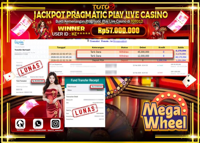Selamat kepada Member Kami Ke****** Telah Jackpot dan berhasil mendapatkan kemenangan besar pada permainan JACKPOT PRAGMATIC PLAY LIVE GAMES CASINO (PP LIVE MEGA WHEEL) Dengan Kemenangan Sebesar Rp.57.000.000–.