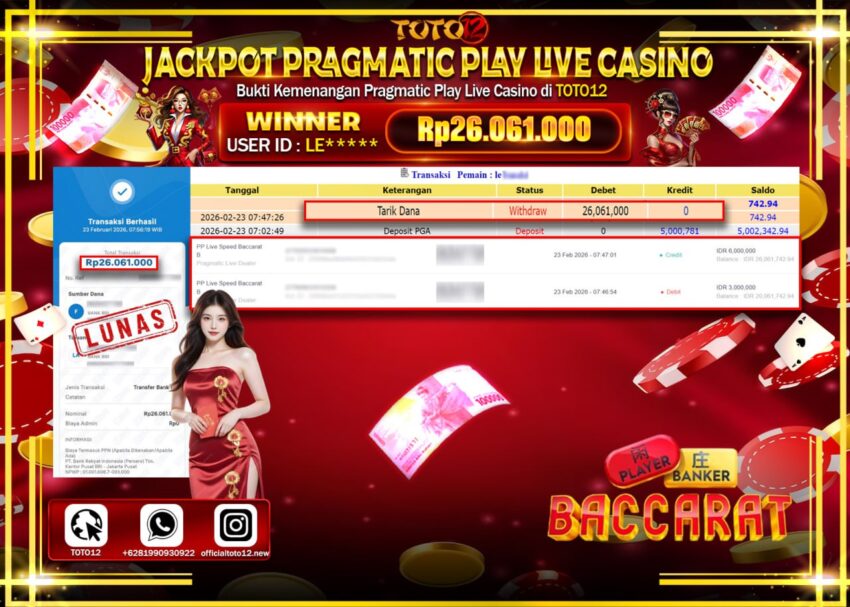 Selamat kepada Member Kami LE**** Telah Jackpot dan berhasil mendapatkan kemenangan besar pada permainan JACKPOT PRAGMATICK PLAY LIVE GAME CASINO (BACCARAT) Dengan Kemenangan Sebesar Rp.26.061.000–. Setelah mengisi Fomulir Withdraw dengan Kurang waktu 1-2 Menit Dana sudah kami Trasnfer kepada Pemilik Userid dan dana sudah dapat di cairkan oleh pemenang. Bukti Pembayaran yang TOTO12 berikan merupakan Bukti Pembayaran yang SAH / VALID yang langsung Di dapatkan melalui transaksi dari Bank yang di Tunju.