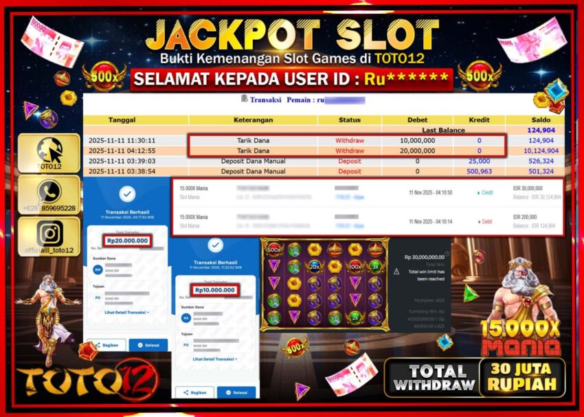 Selamat kepada Member Kami Ru****** Telah Jackpot dan berhasil mendapatkan kemenangan besar pada permainan JACKPOT SLOT GAME (15.000X MANIA) Dengan Kemenangan Sebesar Rp.30.000.000 –. Setelah mengisi Fomulir Withdraw dengan Kurang waktu 1-2 Menit Dana sudah kami Trasnfer kepada Pemilik Userid dan dana sudah dapat di cairkan oleh pemenang. Bukti Pembayaran yang TOTO12 berikan merupakan Bukti Pembayaran yang SAH / VALID yang langsung Di dapatkan melalui transaksi dari Bank yang di Tunju.