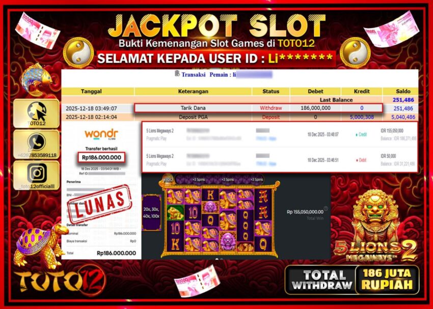 Selamat kepada Member Kami Li****** Telah Jackpot dan berhasil mendapatkan kemenangan besar pada permainan JACKPOT SLOT GAME (5 LIONS MEGAWAYS 2) Dengan Kemenangan Sebesar Rp.186.000.000 –.