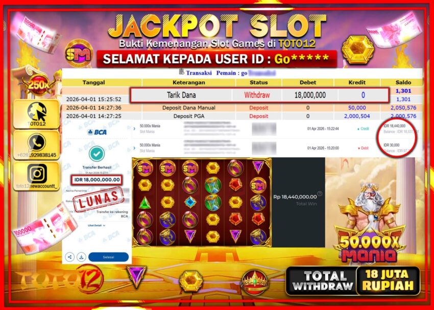Selamat kepada Member Kami Go***** Telah Jackpot dan berhasil mendapatkan kemenangan besar pada permainan JACKPOT SLOT GAME  (50.000 X MANIA)  Dengan Kemenangan Sebesar Rp.18.000.000–.