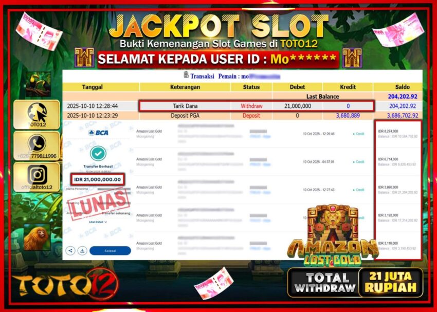 Selamat kepada Member Kami Mo****** Telah Jackpot dan berhasil mendapatkan kemenangan besar pada permainan JACKPOT SLOT GAME (AMAZON LOST GOLD)  Dengan Kemenangan Sebesar Rp.21.000.000 –.  Setelah mengisi Fomulir Withdraw dengan Kurang waktu 1-2 Menit Dana sudah kami Trasnfer kepada Pemilik Userid dan dana sudah dapat di cairkan oleh pemenang. Bukti Pembayaran yang TOTO12 berikan merupakan Bukti Pembayaran yang  SAH / VALID yang langsung Di dapatkan melalui transaksi dari Bank yang di Tunju.