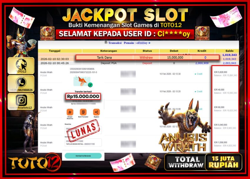 Selamat kepada Member Kami Ci****oy Telah Jackpot dan berhasil mendapatkan kemenangan besar pada permainan JACKPOT SLOT GAME (ANUBIS WRATH) Dengan Kemenangan Sebesar Rp.15.000.000–.