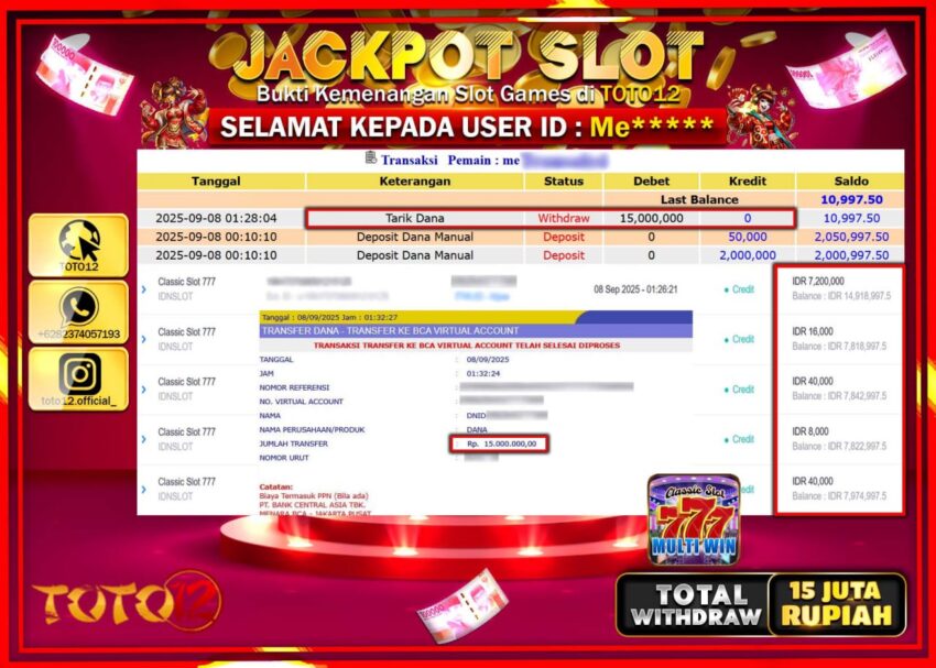Selamat kepada Member Kami Me****** Telah Jackpot dan berhasil mendapatkan kemenangan besar pada permainan JACKPOT SLOT GAME (CLASSIC SLOT 777) Dengan Kemenangan Sebesar Rp.15.000.000 –. Setelah mengisi Fomulir Withdraw dengan Kurang waktu 1-2 Menit Dana sudah kami Trasnfer kepada Pemilik Userid dan dana sudah dapat di cairkan oleh pemenang. Bukti Pembayaran yang TOTO12 berikan merupakan Bukti Pembayaran yang SAH / VALID yang langsung Di dapatkan melalui transaksi dari Bank yang di Tunju.
