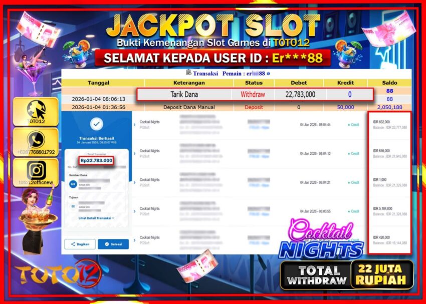 HANYA DI TOTO12 JP PASTI DI BAYAR LUNAS DAN CEPAT!!!!!! JACKPOT SLOT GAME (COCKTAIL NIGHTS) Rp.22.783.000 !!!!