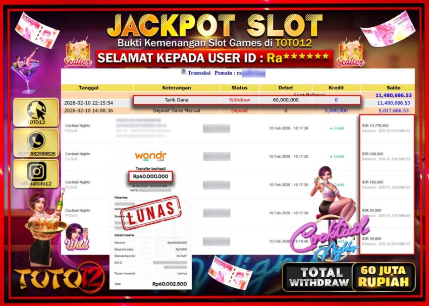 Selamat kepada Member Kami Ra*****  Telah Jackpot dan berhasil mendapatkan kemenangan besar pada permainan JACKPOT SLOT GAME  (COCKTAIL NIGHTS)  Dengan Kemenangan Sebesar Rp.60.000.000–.