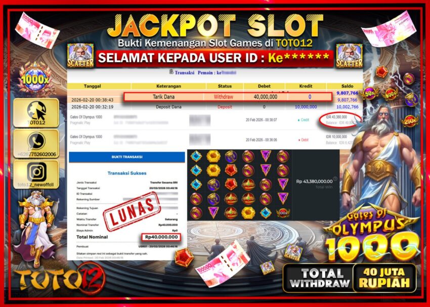 Selamat kepada Member Kami Ke****** Telah Jackpot dan berhasil mendapatkan kemenangan besar pada permainan JACKPOT SLOT GAME (GATE OF OLYMPUS 1000) Dengan Kemenangan Sebesar Rp.40.000.000–.