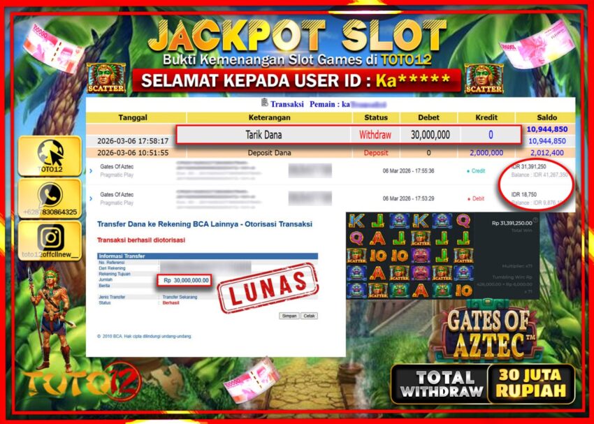 HANYA DI TOTO12 JP PASTI DI BAYAR LUNAS DAN CEPAT!!!!!! JACKPOT SLOT GAME (GATES OF AZTEC) Rp.30.000.000!!!!
