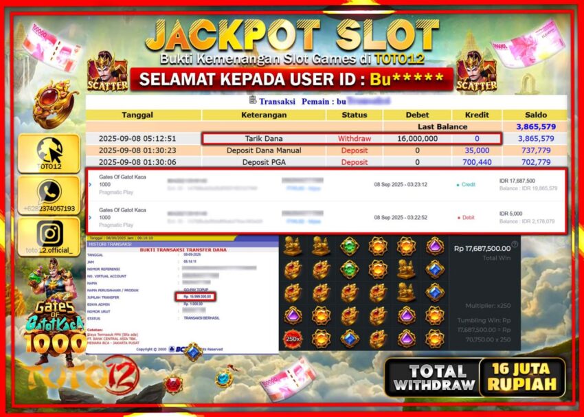 Selamat kepada Member Kami Bu****** Telah Jackpot dan berhasil mendapatkan kemenangan besar pada permainan JACKPOT SLOT GAME (GATES OF GATOT KACA 1000)  Dengan Kemenangan Sebesar Rp.16.000.000 –.  Setelah mengisi Fomulir Withdraw dengan Kurang waktu 1-2 Menit Dana sudah kami Trasnfer kepada Pemilik Userid dan dana sudah dapat di cairkan oleh pemenang. Bukti Pembayaran yang TOTO12 berikan merupakan Bukti Pembayaran yang  SAH / VALID yang langsung Di dapatkan melalui transaksi dari Bank yang di Tunju.