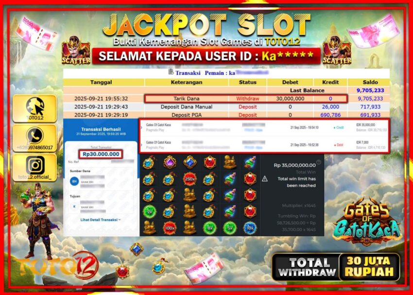 Selamat kepada Member Kami Ka****** Telah Jackpot dan berhasil mendapatkan kemenangan besar pada permainan JACKPOT SLOT GAME (GATES OF GATOT KACA) Dengan Kemenangan Sebesar Rp.30.000.000 –. Setelah mengisi Fomulir Withdraw dengan Kurang waktu 1-2 Menit Dana sudah kami Trasnfer kepada Pemilik Userid dan dana sudah dapat di cairkan oleh pemenang. Bukti Pembayaran yang TOTO12 berikan merupakan Bukti Pembayaran yang SAH / VALID yang langsung Di dapatkan melalui transaksi dari Bank yang di Tunju.