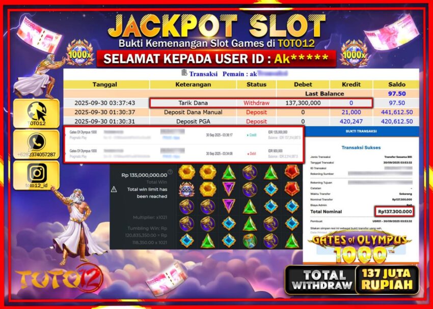 Selamat kepada Member Kami Ak****** Telah Jackpot dan berhasil mendapatkan kemenangan besar pada permainan JACKPOT SLOT GAME (GATES OF OLYMPUS 1000) Dengan Kemenangan Sebesar Rp.137.300.000 –. Setelah mengisi Fomulir Withdraw dengan Kurang waktu 1-2 Menit Dana sudah kami Trasnfer kepada Pemilik Userid dan dana sudah dapat di cairkan oleh pemenang. Bukti Pembayaran yang TOTO12 berikan merupakan Bukti Pembayaran yang SAH / VALID yang langsung Di dapatkan melalui transaksi dari Bank yang di Tunju.