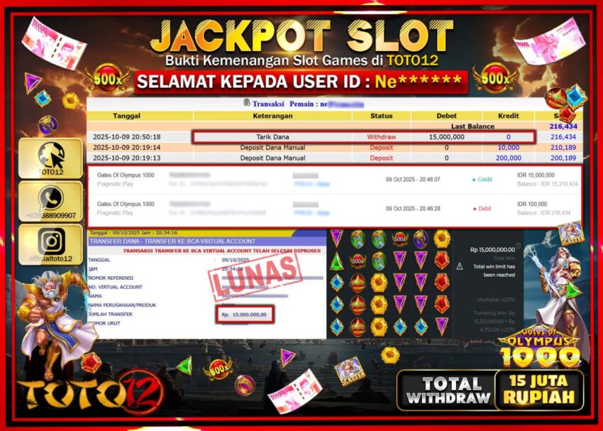Selamat kepada Member Kami Ne****** Telah Jackpot dan berhasil mendapatkan kemenangan besar pada permainan JACKPOT SLOT GAME (GATES OF OLYMPUS 1000) Dengan Kemenangan Sebesar Rp.15.000.000 –. Setelah mengisi Fomulir Withdraw dengan Kurang waktu 1-2 Menit Dana sudah kami Trasnfer kepada Pemilik Userid dan dana sudah dapat di cairkan oleh pemenang. Bukti Pembayaran yang TOTO12 berikan merupakan Bukti Pembayaran yang SAH / VALID yang langsung Di dapatkan melalui transaksi dari Bank yang di Tunju.