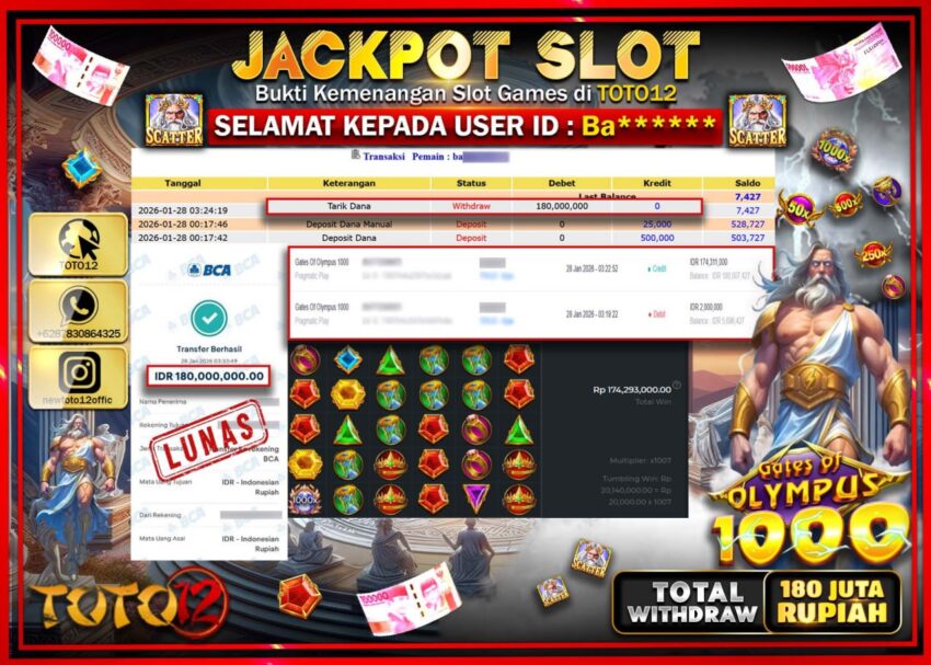 Selamat kepada Member Kami Ba****** Telah Jackpot dan berhasil mendapatkan kemenangan besar pada permainan JACKPOT SLOT GAME (GATES OF OLYMPUS 1000) Dengan Kemenangan Sebesar Rp.180.000.000 –.