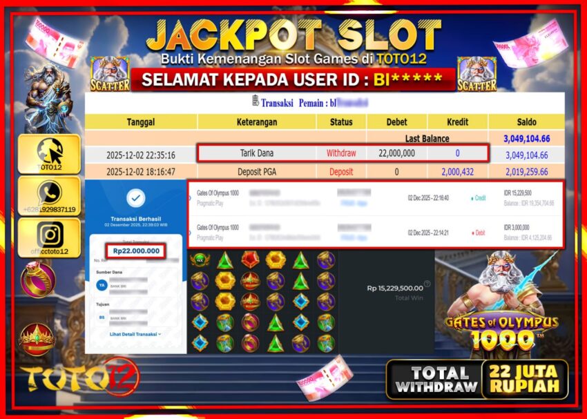 HANYA DI TOTO12 JP PASTI DI BAYAR LUNAS DAN CEPAT!!!!!! JACKPOT SLOT GAME (GATES OF OLYMPUS 1000) Rp.22.000.000 !!!!