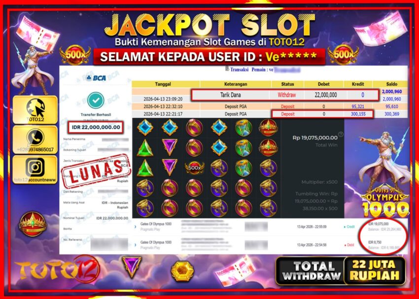 Selamat kepada Member Kami Ve***** Telah Jackpot dan berhasil mendapatkan kemenangan besar pada permainan JACKPOT SLOT GAME (GATES OF OLYMPUS 1000) Dengan Kemenangan Sebesar Rp.22.000.000–.