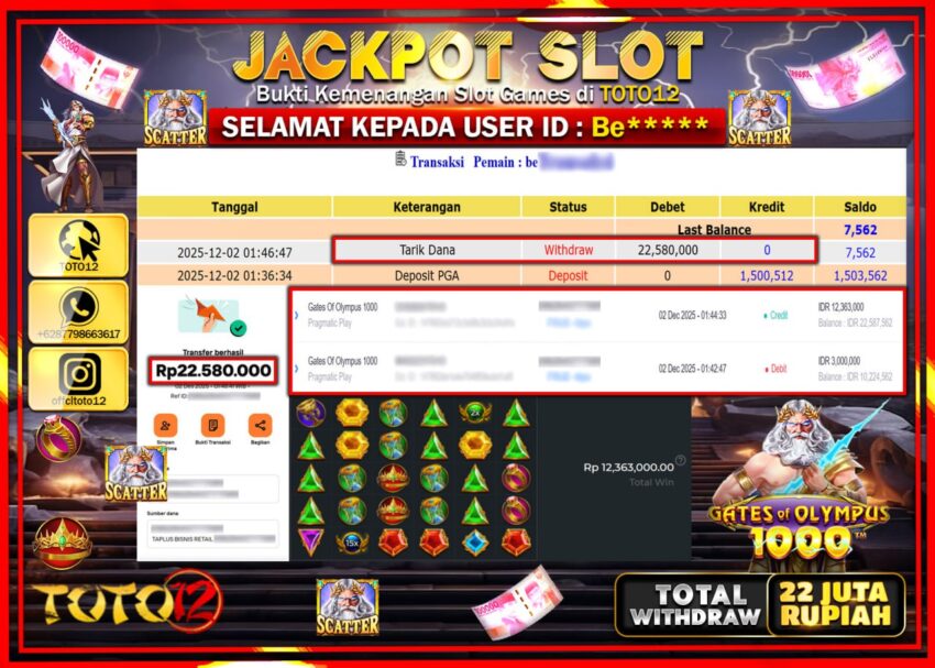 Selamat kepada Member Kami Be****** Telah Jackpot dan berhasil mendapatkan kemenangan besar pada permainan JACKPOT SLOT GAME (GATES OF OLYMPUS 1000) Dengan Kemenangan Sebesar Rp.22.580.000 –.