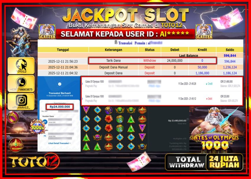 Selamat kepada Member Kami Al****** Telah Jackpot dan berhasil mendapatkan kemenangan besar pada permainan JACKPOT SLOT GAME (GATES OF OLYMPUS 1000) Dengan Kemenangan Sebesar Rp.24.000.000 –.