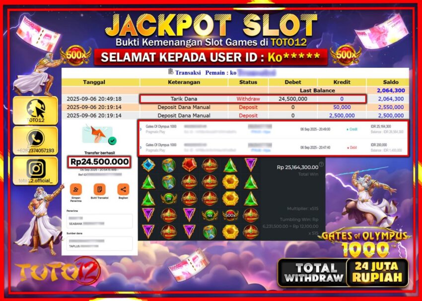 Selamat kepada Member Kami Ko****** Telah Jackpot dan berhasil mendapatkan kemenangan besar pada permainan JACKPOT SLOT GAME (GATES OF OLYMPUS 1000) Dengan Kemenangan Sebesar Rp.24.500.000 –. Setelah mengisi Fomulir Withdraw dengan Kurang waktu 1-2 Menit Dana sudah kami Trasnfer kepada Pemilik Userid dan dana sudah dapat di cairkan oleh pemenang. Bukti Pembayaran yang TOTO12 berikan merupakan Bukti Pembayaran yang SAH / VALID yang langsung Di dapatkan melalui transaksi dari Bank yang di Tunju.