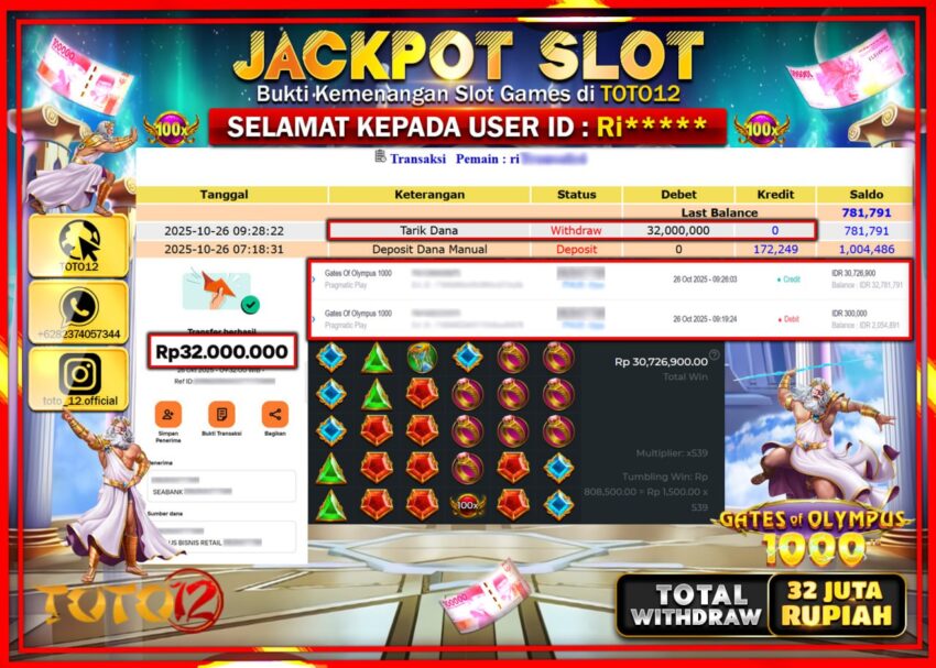 Selamat kepada Member Kami Ri****** Telah Jackpot dan berhasil mendapatkan kemenangan besar pada permainan JACKPOT SLOT GAME (GATES OF OLYMPUS 1000) Dengan Kemenangan Sebesar Rp.32.000.000 –. Setelah mengisi Fomulir Withdraw dengan Kurang waktu 1-2 Menit Dana sudah kami Trasnfer kepada Pemilik Userid dan dana sudah dapat di cairkan oleh pemenang. Bukti Pembayaran yang TOTO12 berikan merupakan Bukti Pembayaran yang SAH / VALID yang langsung Di dapatkan melalui transaksi dari Bank yang di Tunju.
