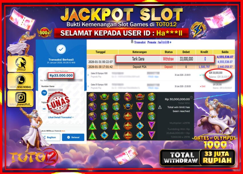 HANYA DI TOTO12 JP PASTI DI BAYAR LUNAS DAN CEPAT!!!!!! JACKPOT SLOT GAME (GATES OF OLYMPUS 1000) Rp.33.000.000 !!!!