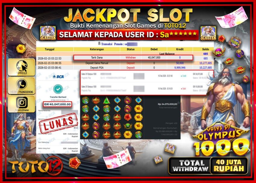 HANYA DI TOTO12 JP PASTI DI BAYAR LUNAS DAN CEPAT!!!!!! JACKPOT SLOT GAME (GATES OF OLYMPUS 1000) Rp.40.047.000!!!!