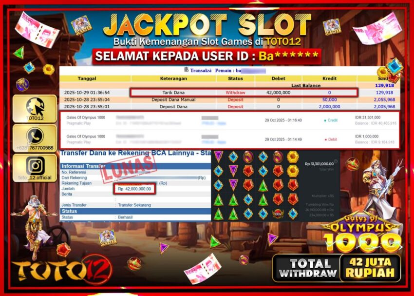 Selamat kepada Member Kami Ba****** Telah Jackpot dan berhasil mendapatkan kemenangan besar pada permainan JACKPOT SLOT GAME (GATES OF OLYMPUS 1000)  Dengan Kemenangan Sebesar Rp.42.000.000 –.  Setelah mengisi Fomulir Withdraw dengan Kurang waktu 1-2 Menit Dana sudah kami Trasnfer kepada Pemilik Userid dan dana sudah dapat di cairkan oleh pemenang. Bukti Pembayaran yang TOTO12 berikan merupakan Bukti Pembayaran yang  SAH / VALID yang langsung Di dapatkan melalui transaksi dari Bank yang di Tunju.