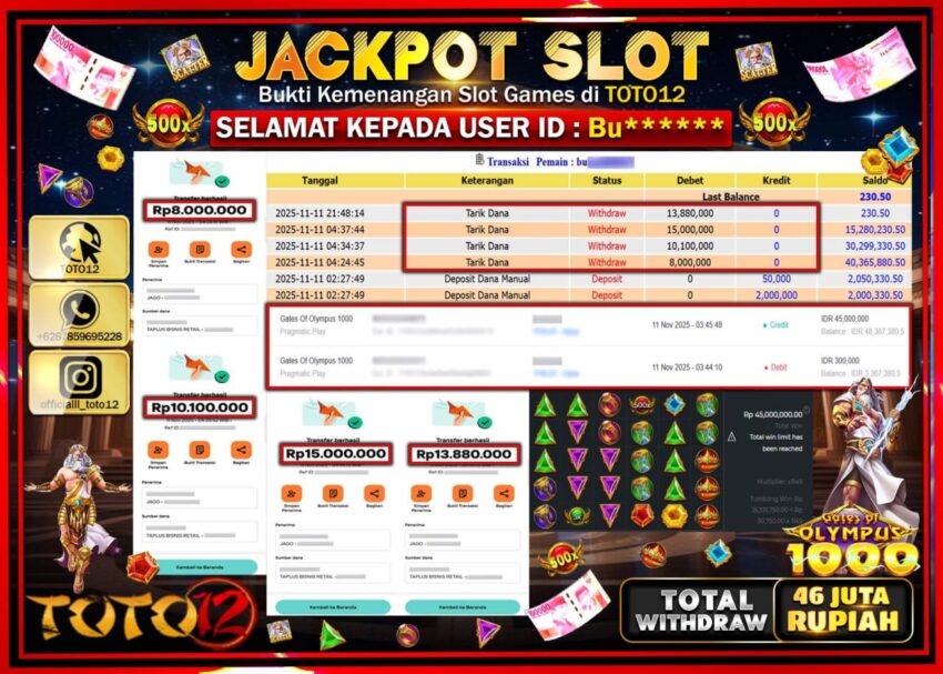 Selamat kepada Member Kami Bu****** Telah Jackpot dan berhasil mendapatkan kemenangan besar pada permainan JACKPOT SLOT GAME (GATES OF OLYMPUS 1000)  Dengan Kemenangan Sebesar Rp.46.980.000 –.  Setelah mengisi Fomulir Withdraw dengan Kurang waktu 1-2 Menit Dana sudah kami Trasnfer kepada Pemilik Userid dan dana sudah dapat di cairkan oleh pemenang. Bukti Pembayaran yang TOTO12 berikan merupakan Bukti Pembayaran yang  SAH / VALID yang langsung Di dapatkan melalui transaksi dari Bank yang di Tunju.