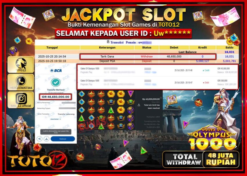 Selamat kepada Member Kami Uw****** Telah Jackpot dan berhasil mendapatkan kemenangan besar pada permainan JACKPOT SLOT GAME (GATES OF OLYMPUS 1000) Dengan Kemenangan Sebesar Rp.48.650.000 –. Setelah mengisi Fomulir Withdraw dengan Kurang waktu 1-2 Menit Dana sudah kami Trasnfer kepada Pemilik Userid dan dana sudah dapat di cairkan oleh pemenang. Bukti Pembayaran yang TOTO12 berikan merupakan Bukti Pembayaran yang SAH / VALID yang langsung Di dapatkan melalui transaksi dari Bank yang di Tunju.