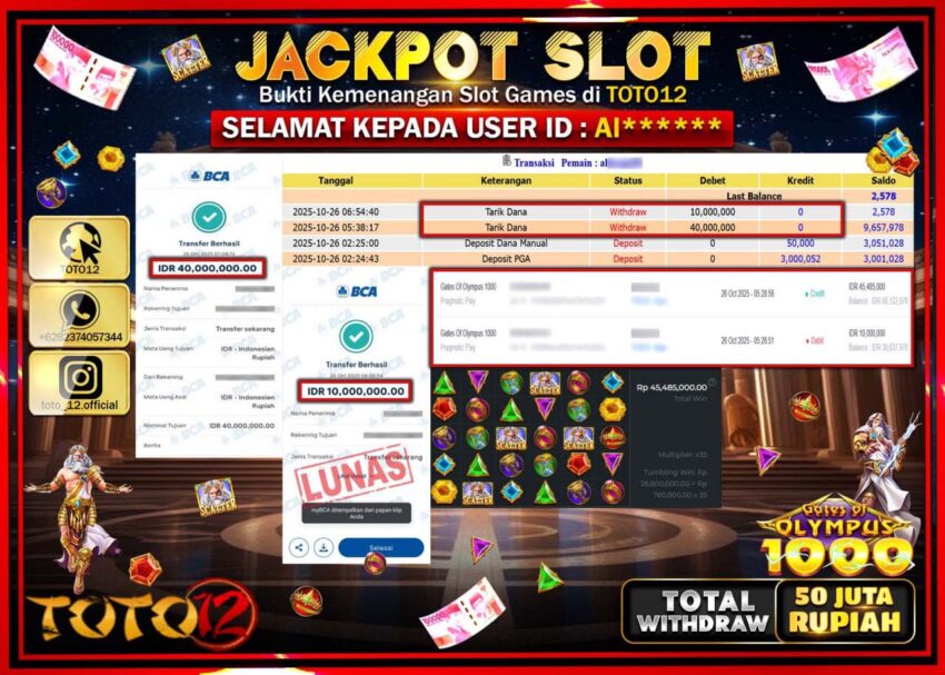 Selamat kepada Member Kami Al****** Telah Jackpot dan berhasil mendapatkan kemenangan besar pada permainan JACKPOT SLOT GAME (GATES OF OLYMPUS 1000) Dengan Kemenangan Sebesar Rp.50.000.000 –. Setelah mengisi Fomulir Withdraw dengan Kurang waktu 1-2 Menit Dana sudah kami Trasnfer kepada Pemilik Userid dan dana sudah dapat di cairkan oleh pemenang. Bukti Pembayaran yang TOTO12 berikan merupakan Bukti Pembayaran yang SAH / VALID yang langsung Di dapatkan melalui transaksi dari Bank yang di Tunju.