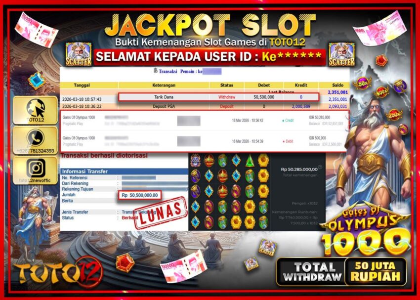 Selamat kepada Member Kami Ke****** Telah Jackpot dan berhasil mendapatkan kemenangan besar pada permainan JACKPOT SLOT GAME (GATES OF OLYMPUS 1000) Dengan Kemenangan Sebesar Rp.50.500.000.