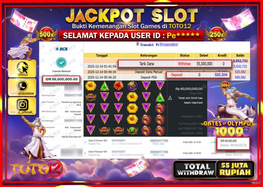 Selamat kepada Member Kami Pe****** Telah Jackpot dan berhasil mendapatkan kemenangan besar pada permainan JACKPOT SLOT GAME (GATES OF OLYMPUS 1000) Dengan Kemenangan Sebesar Rp.55.000.000 –.