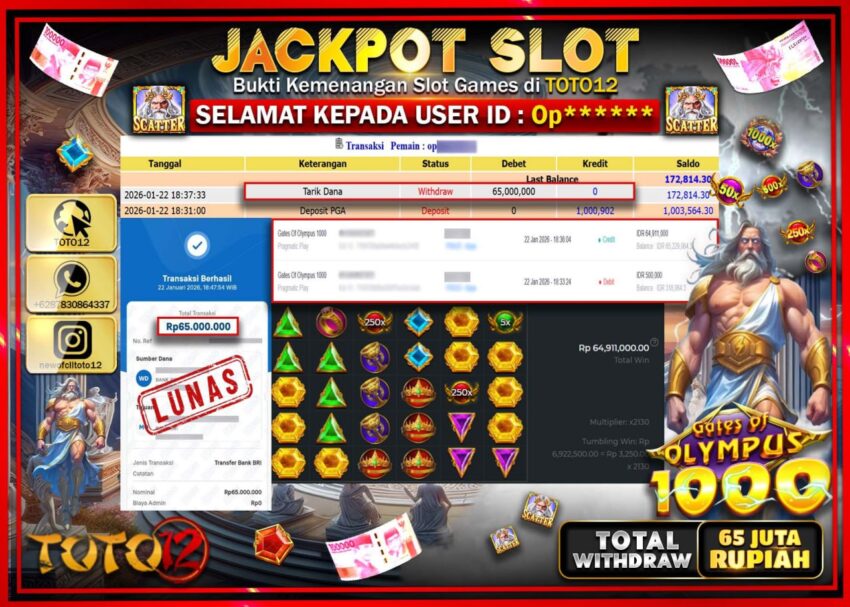 Selamat kepada Member Kami Op****** Telah Jackpot dan berhasil mendapatkan kemenangan besar pada permainan JACKPOT SLOT GAME (GATES OF OLYMPUS 1000) Dengan Kemenangan Sebesar Rp.65.000.000 –.