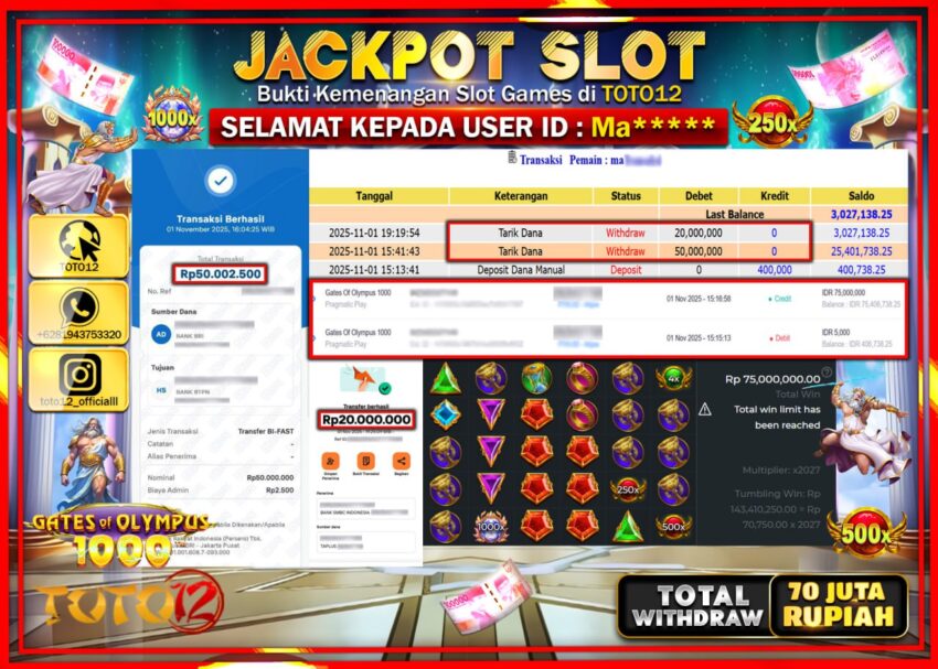 Selamat kepada Member Kami Ma****** Telah Jackpot dan berhasil mendapatkan kemenangan besar pada permainan JACKPOT SLOT GAME (GATES OF OLYMPUS 1000) Dengan Kemenangan Sebesar Rp.70.000.000 –. Setelah mengisi Fomulir Withdraw dengan Kurang waktu 1-2 Menit Dana sudah kami Trasnfer kepada Pemilik Userid dan dana sudah dapat di cairkan oleh pemenang. Bukti Pembayaran yang TOTO12 berikan merupakan Bukti Pembayaran yang SAH / VALID yang langsung Di dapatkan melalui transaksi dari Bank yang di Tunju.